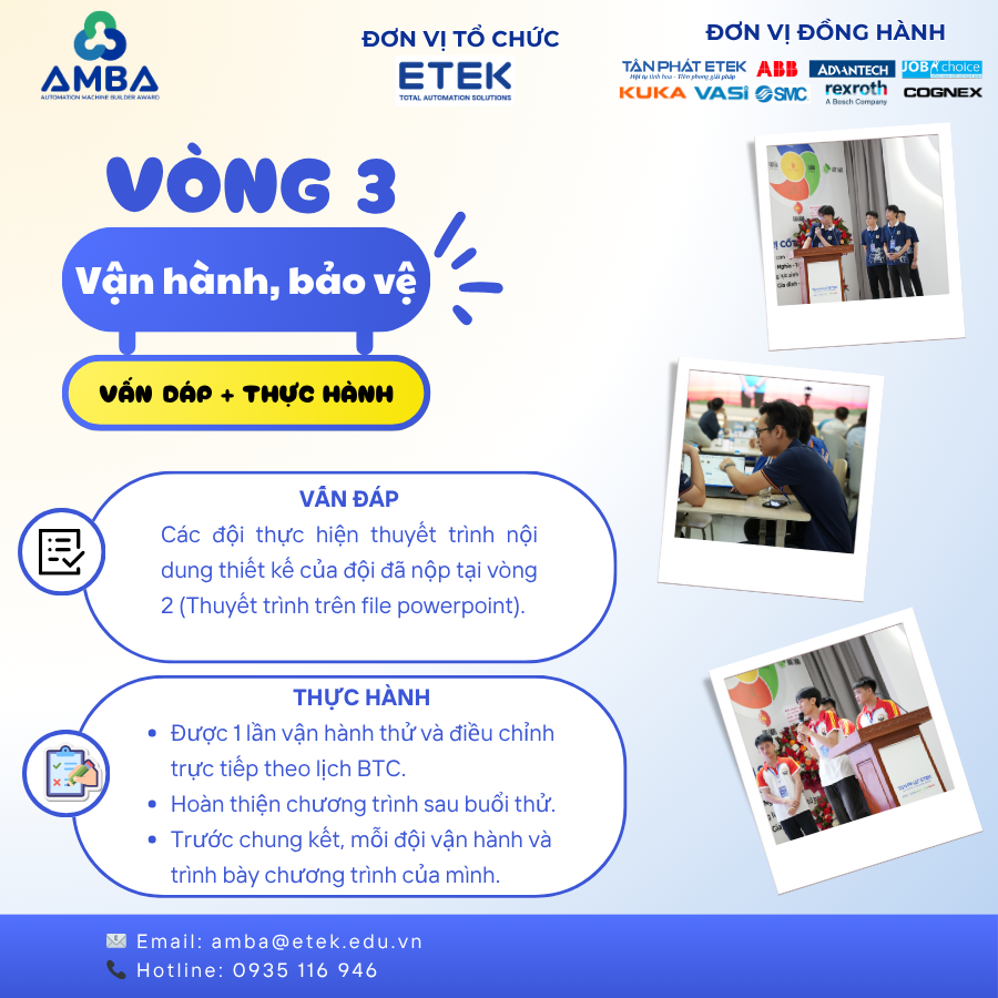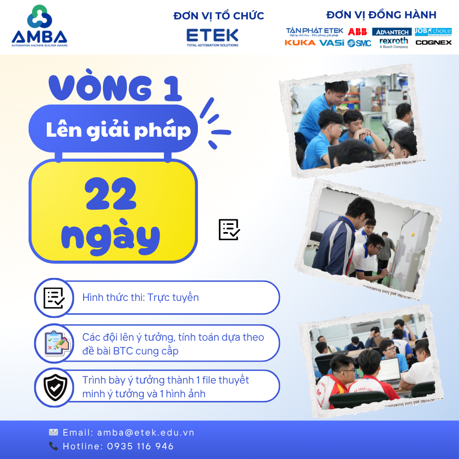 AMBA 2026 gồm 3 vòng thi, dẫn dắt thí sinh đi từ ý tưởng – thiết kế – vận hành thực tế, từng bước chinh phục danh hiệu “Nhà Xây Dựng Máy Tự Động Hóa Xuất Sắc Nhất”.